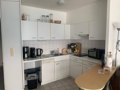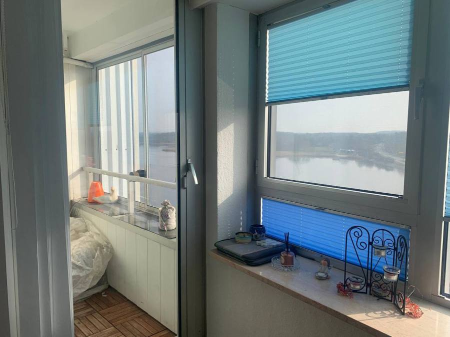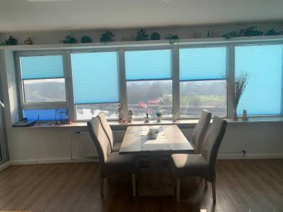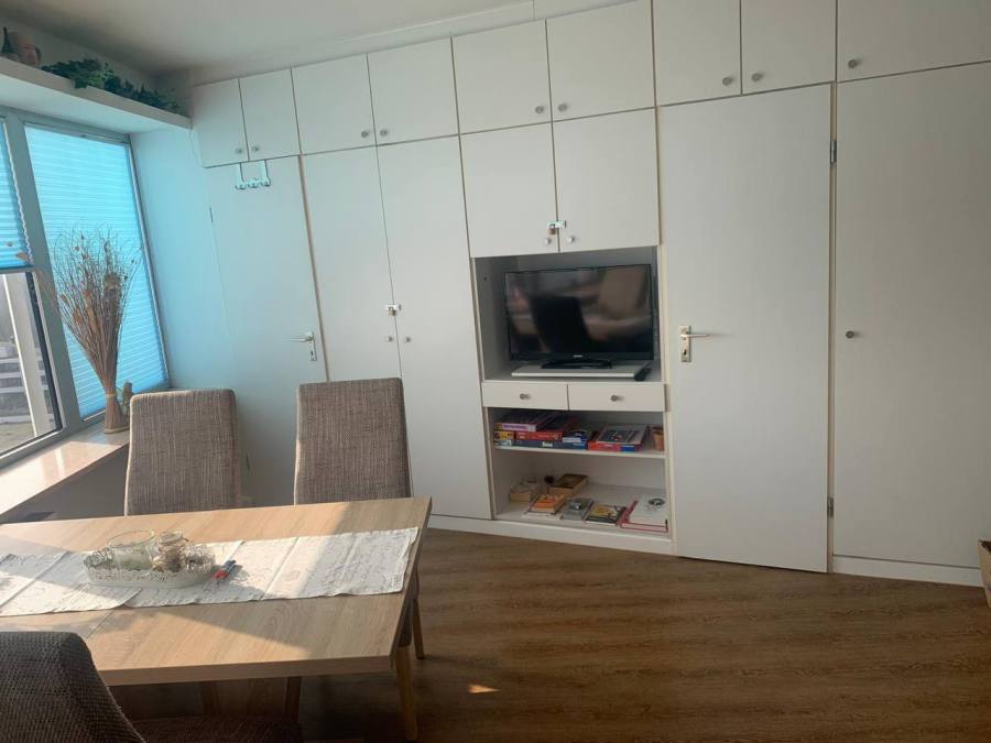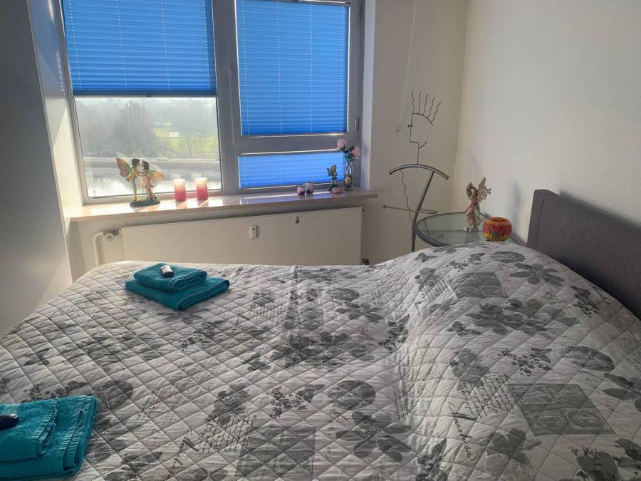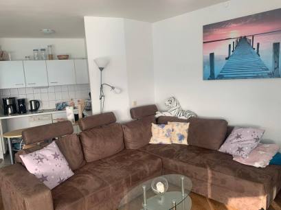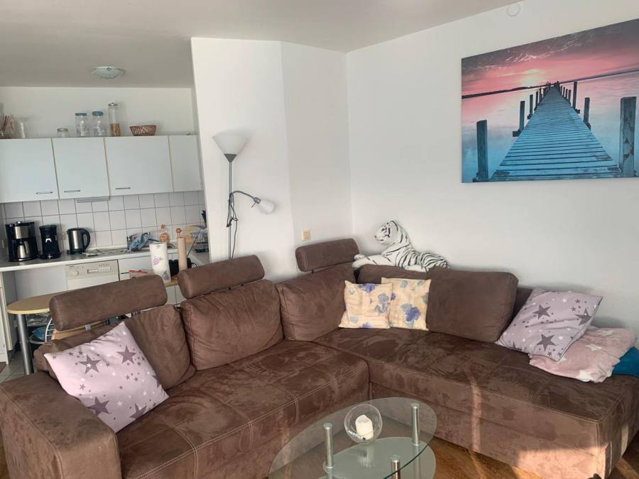 2-Zimmer-Apartment mit Blick auf den Yachthafen und Haithabu. Die Ausrichtung ist nach Süden, also ab 11 Uhr scheint die Sonne auf die Loggia.